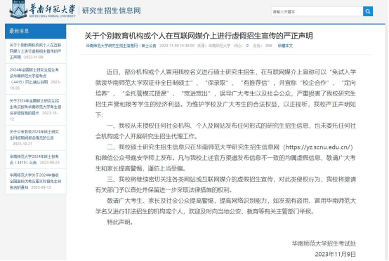 11月9日,华南师范大学布声明称,近日,部分机构或个人冒用学校名义进行硕士研究生招生,在互联网媒介上宣称可以“免试入学就读华南师范大学双证非全日制硕士”“保录取”“有推荐信”,并宣称“校企合作”“定向培养”“全托管模式授课”“宽进宽出”,误导广大考生以及社会公众,严重损害了学校研究生招生声誉和报考学生的经济利益。