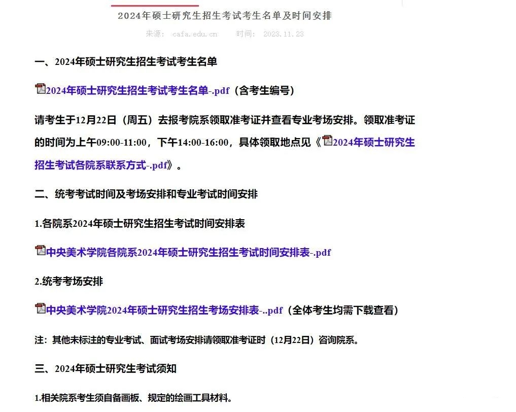 中央美术学院发布了2024年硕士研究生招生考试考生名单及时间安排,相关院系考生须自备画板、规定的绘画工具材料。