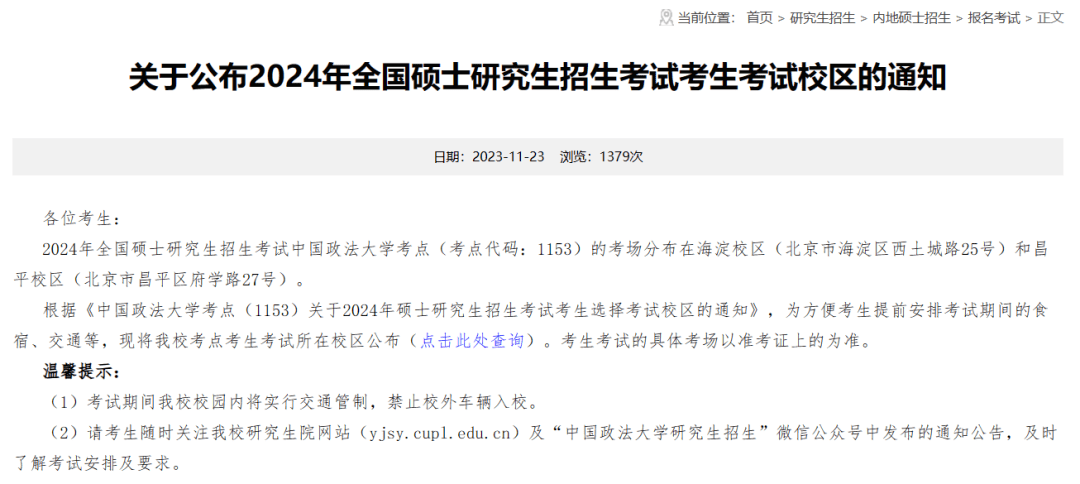 根据《中国政法大学考点(1153)关于2024年硕士研究生招生考试考生选择考试校区的通知》,为方便考生提前安排考试期间的食宿、交通等,现将我校考点考生考试所在校区公布。考生考试的具体考场以准考证上的为准。