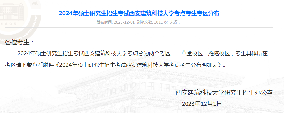 西安建筑科技大学发布了2024年硕士研究生招生考试考点考生考区分布,2024年硕士研究生招生考试西安建筑科技大学考点分为两个考区——草堂校区、雁塔校区,考生具体所在考区可以下载表格查看。