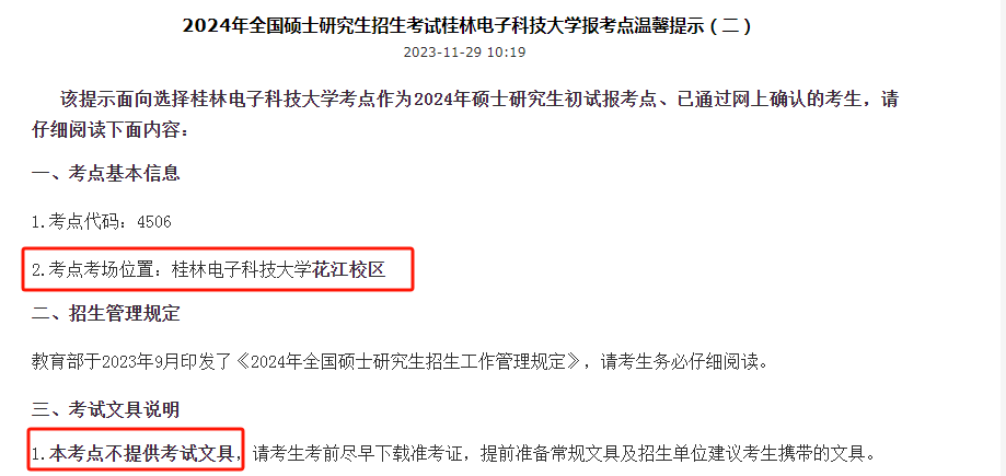 桂林电子科技大学发布了2024年全国硕士研究生招生考试桂林电子科技大学报考点温馨提示,考点考场位置在桂林电子科技大学花江校区,且考点不提供文具。