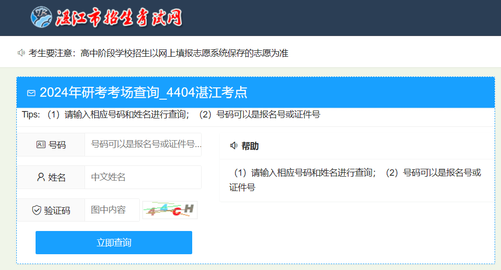 24考研同学注意,广东湛江市已经开通了2024年研考考场查询通道,考生可以登录湛江市招生考试网,输入相应号码和姓名即可查询考场及座位号信息。