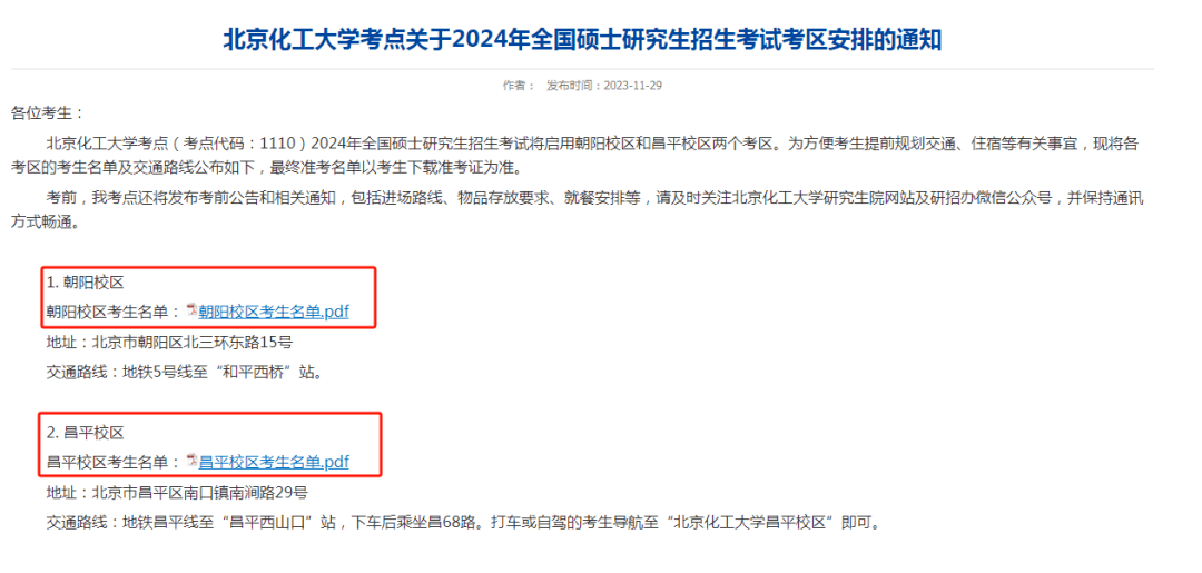 北京化工大学考点发布了关于2024年全国硕士研究生招生考试考区安排的通知,北京化工大学考点(考点代码:1110)2024年全国硕士研究生招生考试将启用朝阳校区和昌平校区两个考区,考生具体所在考区可以下载表格查看。