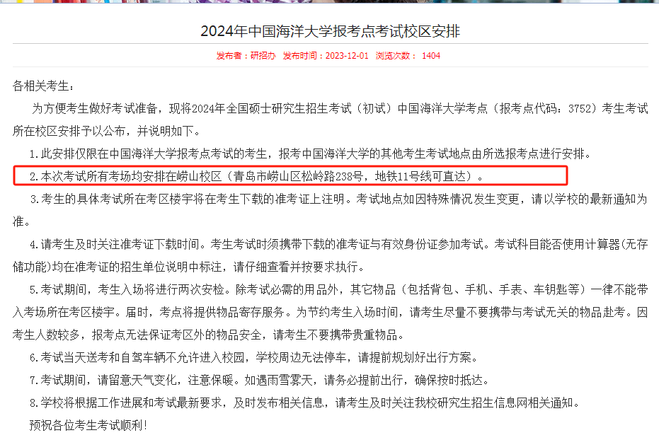 中国海洋大学发布了2024年报考点考试校区安排,本次考试所有考场均安排在崂山校区(青岛市崂山区松岭路238号,地铁11号线可直达)。