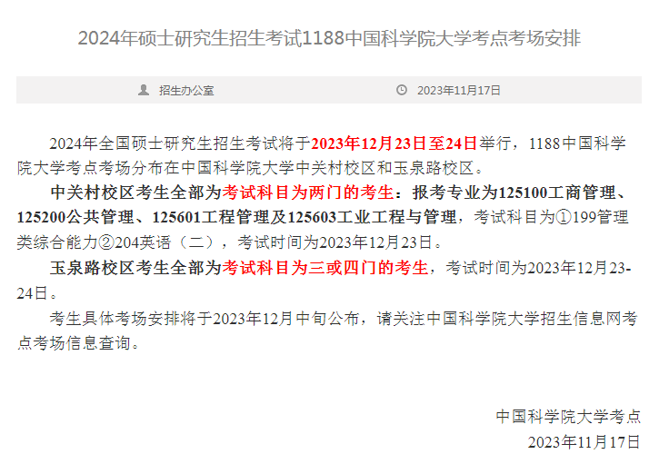中国科学院大学发布了2024年硕士研究生招生考试1188中国科学院大学考点考场安排。