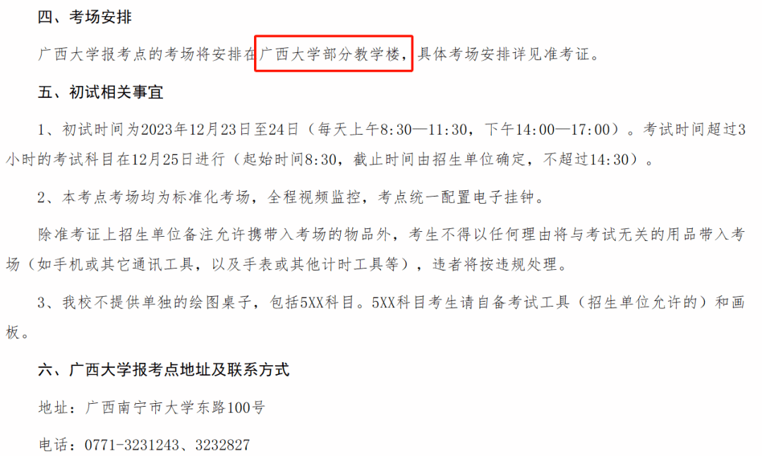 广西大学报考点的考场将安排在广西大学部分教学楼,具体考场安排详见准考证。