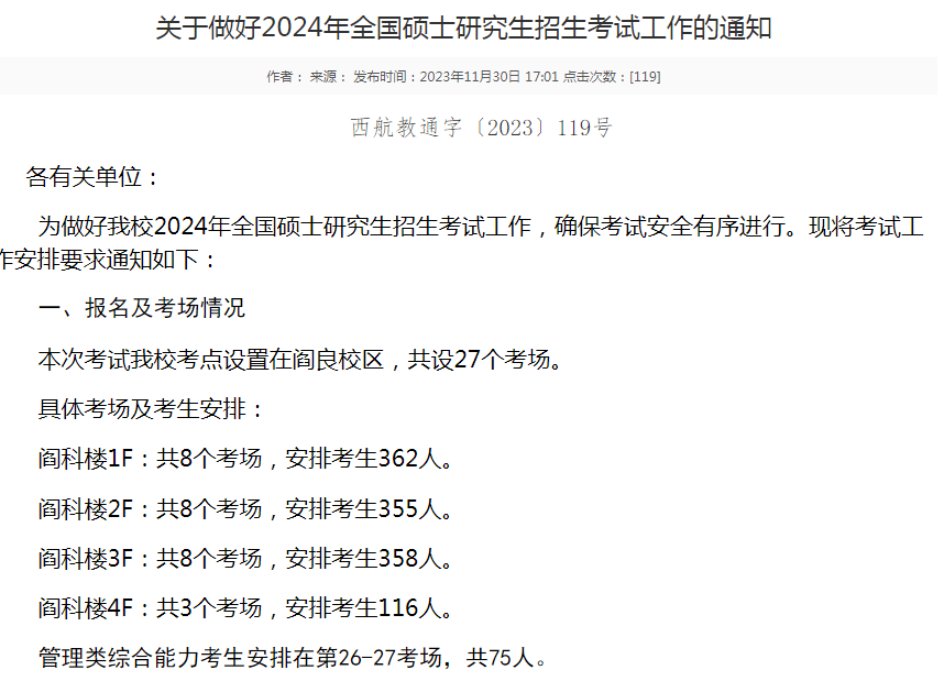 西安航空学院发布了关于做好2024年全国硕士研究生招生考试工作的通知,本次考试考点设置在阎良校区,共设27个考场。