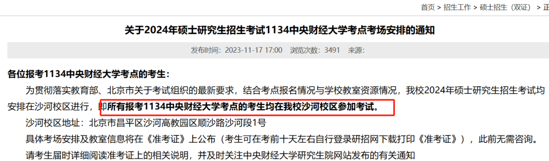 我校2024年硕士研究生招生考试均安排在沙河校区进行,即所有报考1134中央财经大学考点的考生均在我校沙河校区参加考试。