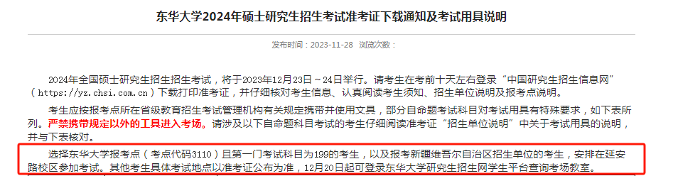 选择东华大学报考点(考点代码3110)且第一门考试科目为199的考生,以及报考新疆维吾尔自治区招生单位的考生,安排在延安路校区参加考试。