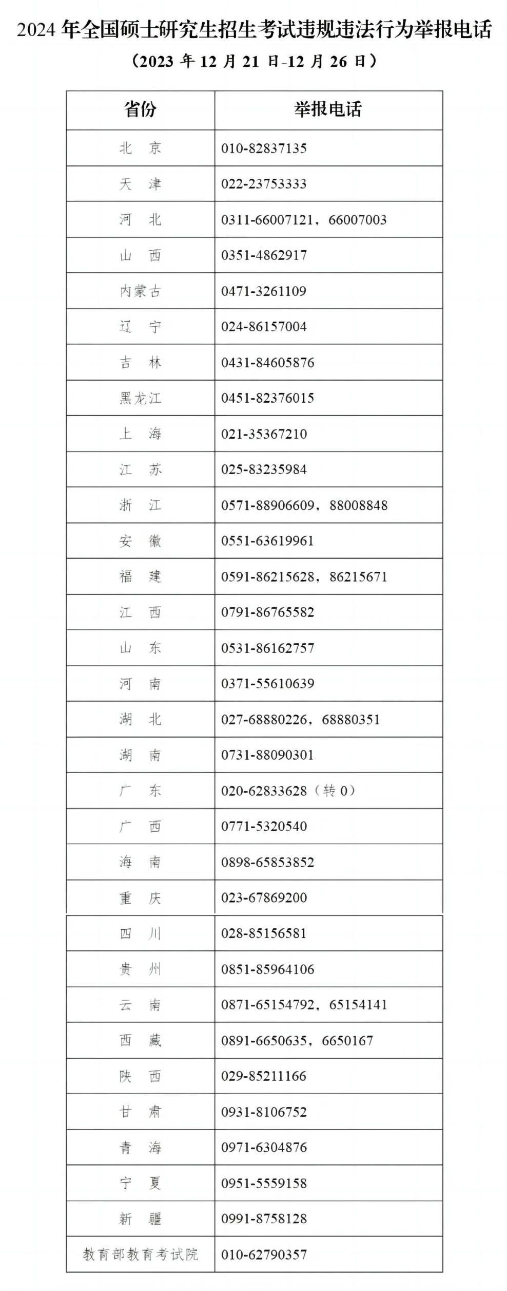 教育部和各省(区、市)教育招生考试机构将开通2024年研考举报电话,欢迎广大考生及社会各界人士及时举报反映有关问题线索。教育部及各省(区、市)将会同有关部门根据举报线索第一时间核查处理,坚决维护风清气正的研考环境。