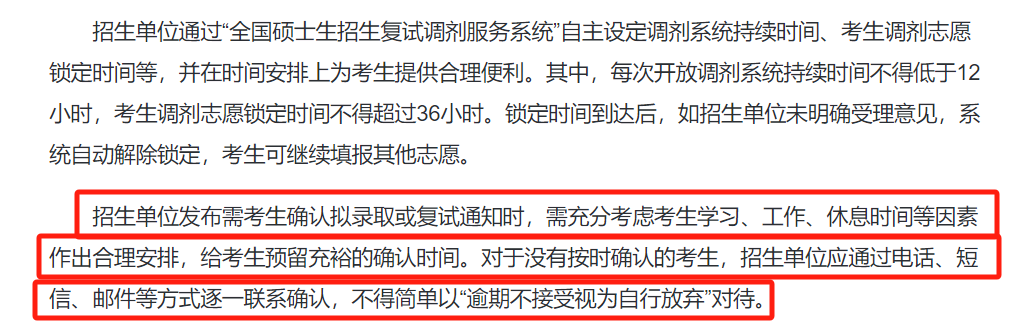 招生单位发布需考生确认拟录取或复试通知时,需充分考虑考生学习、工作、休息时间等因素作出合理安排,给考生预留充裕的确认时间。对于没有按时确认的考生,招生单位应通过电话、短信、邮件等方式逐一联系确认,不得简单以“逾期不接受视为自行放弃”对待。