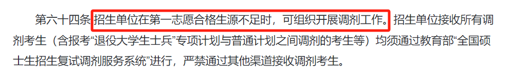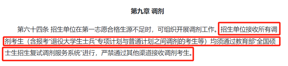 招生单位接收所有调剂考生(含报考“退役大学生士兵”专项计划与普通计划之间调剂的考生等)均须通过教育部“全国硕士生招生复试调剂服务系统”进行,严禁通过其他渠道接收调剂考生。