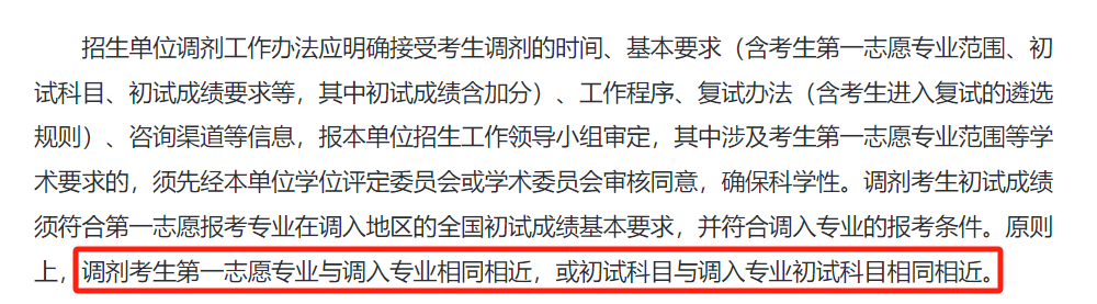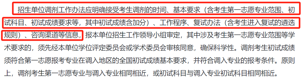 招生单位调剂工作办法应明确接受考生调剂的时间、基本要求(含考生第一志愿专业范围、初试科目、初试成绩要求等,其中初试成绩含加分)、工作程序、复试办法(含考生进入复试的遴选规则)、咨询渠道等信息。