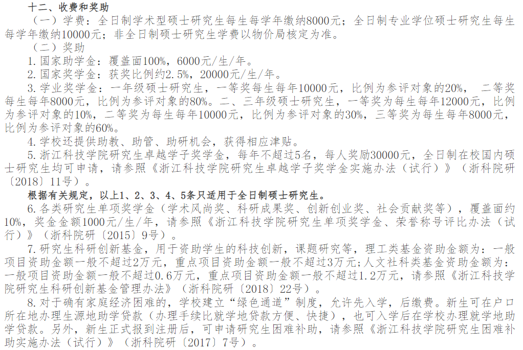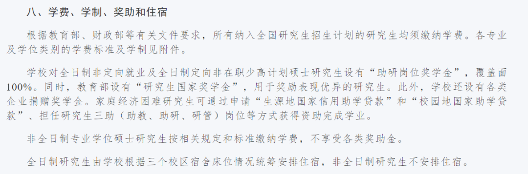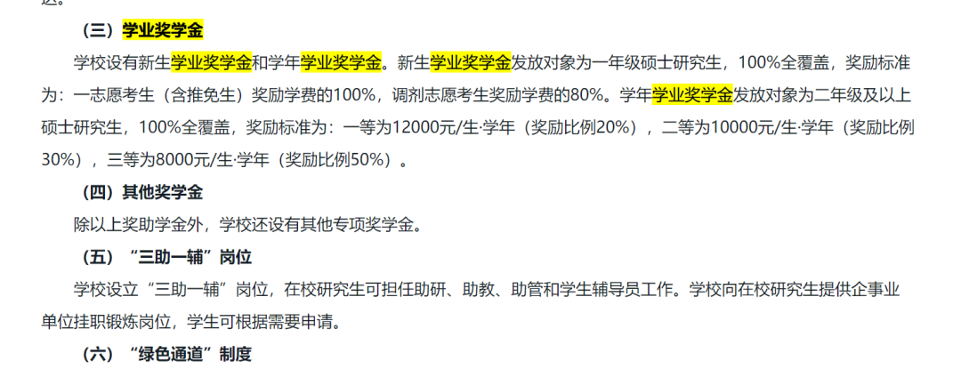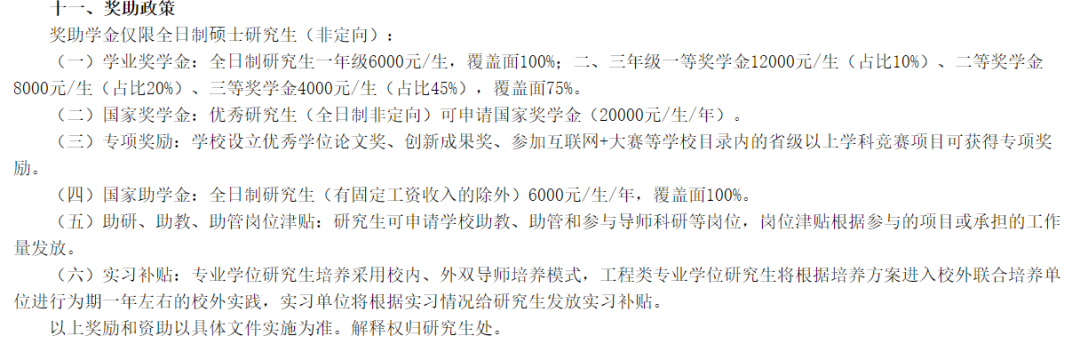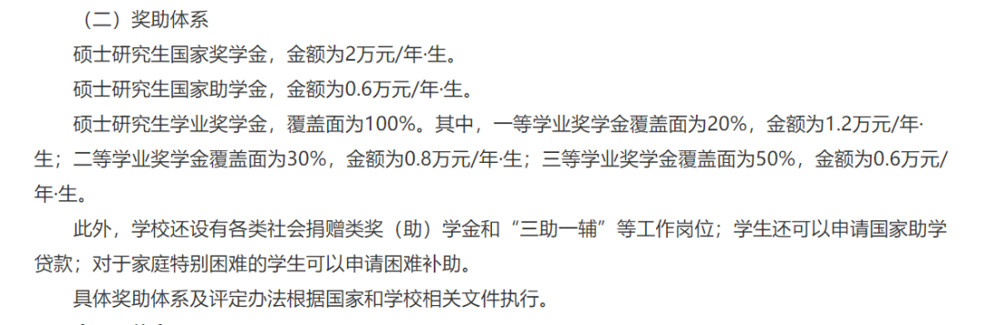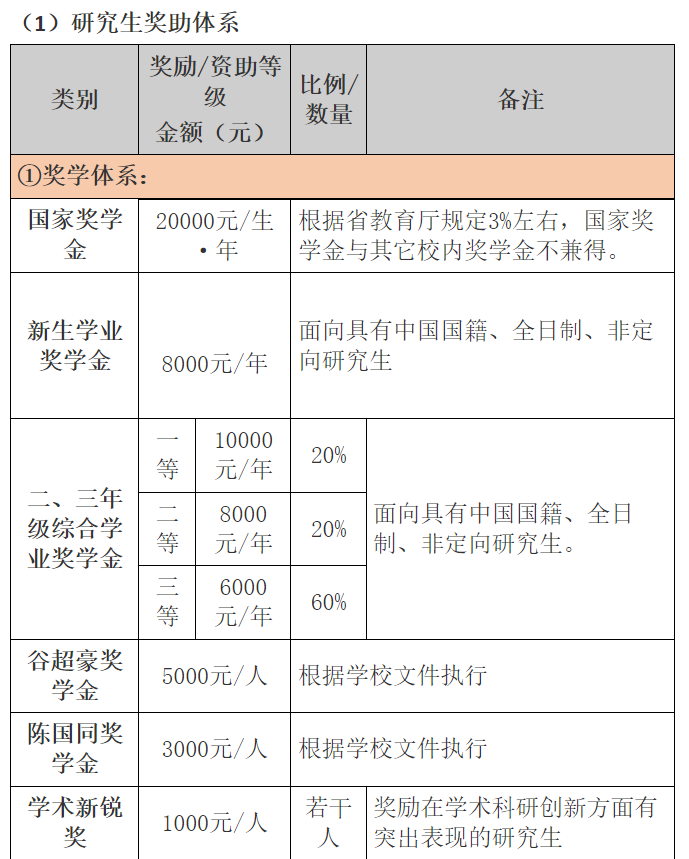 学业奖学金:全日制研究生一年级8000元/生,覆盖面100%;二、三年级一等10000元/生(占比15%)、二等8000元/生(占比25%)、三等6000元/生(占比35%),覆盖面约75%。