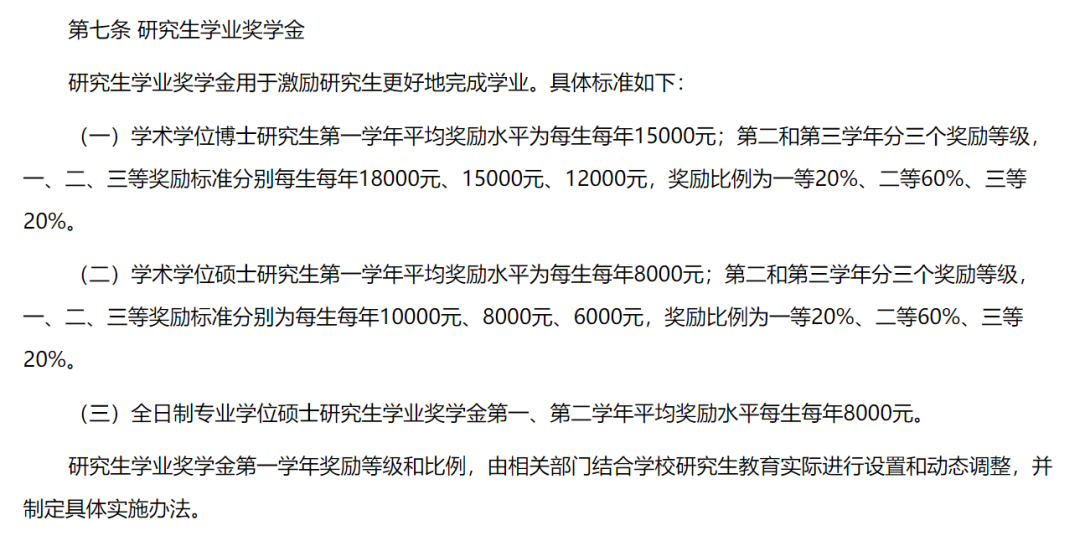 学术学位硕士研究生第一学年平均奖励水平为每生每年8000元;第二和第三学年分三个奖励等级,一、二、三等奖励标准分别为每生每年10000元、8000元、6000元,奖励比例为一等20%、二等60%、三等20%。