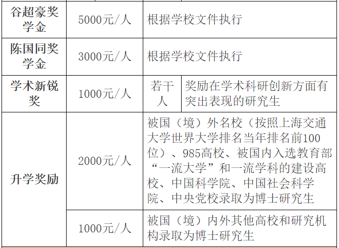 学业奖学金:一年级硕士研究生,一等奖每生每年10000元,比例为参评对象的20%, 二等奖每生每年8000元,比例为参评对象的80%。二、三年级硕士研究生,一等奖为每生每年12000元,比例为参评对象的10%,二等奖为每生每年10000元,比例为参评对象的30%,三等奖为每生每年8000元,比例为参评对象的60%。
