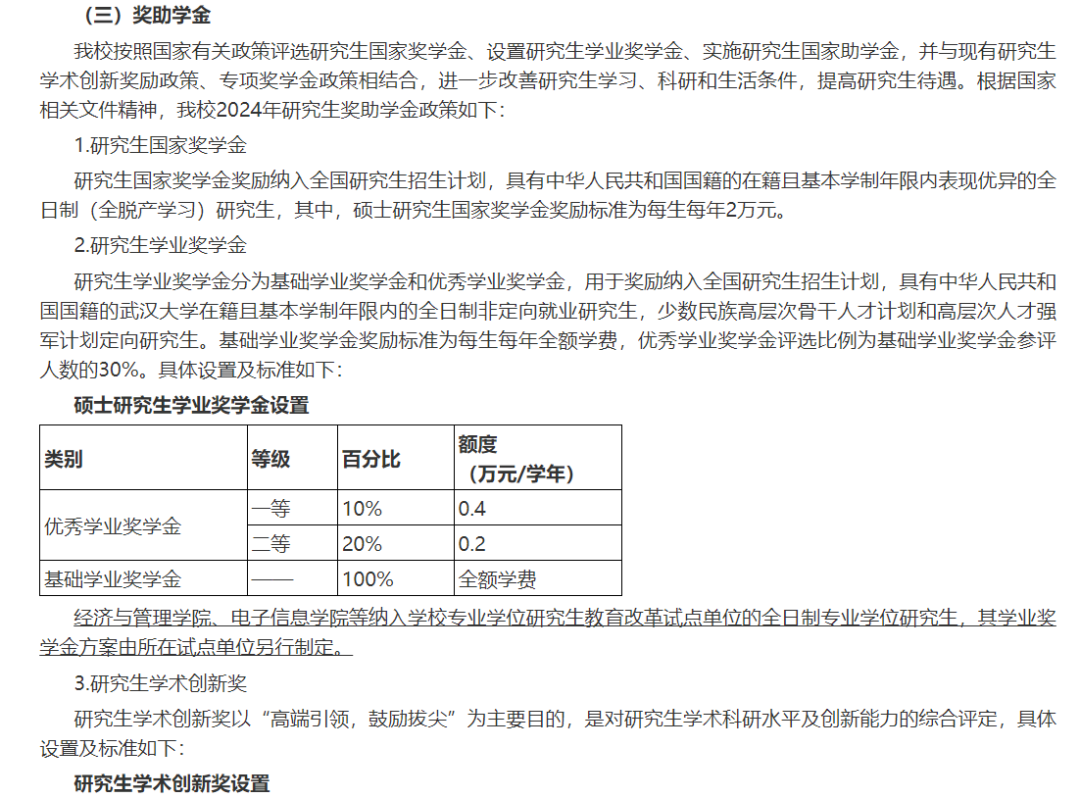 武汉大学奖助学金项目有国家奖学金、研究生学业奖学金、研究生国家助学金,研究生学术创新奖励政策、专项奖学金政策等,其中研究生学业奖学金中基础学业奖学金100%覆盖全额学费。