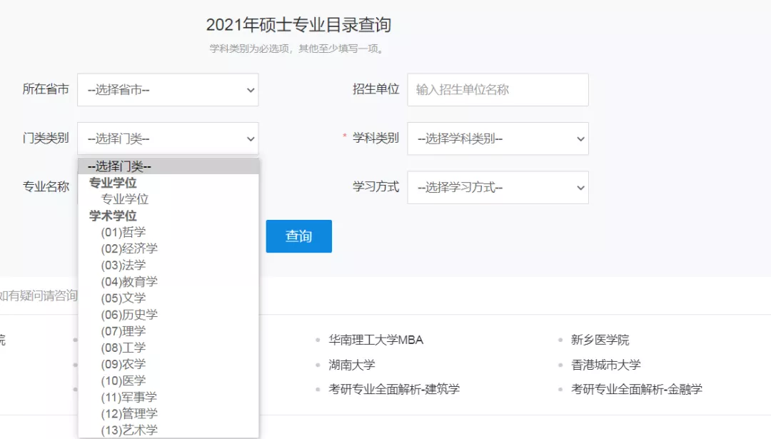 考研共有13大门类类别:01哲学、02经济学、03法学、04教育学、05文学、06历史学、07理学、08工学、09农学、10医学、11军事学、12管理学、13艺术学。